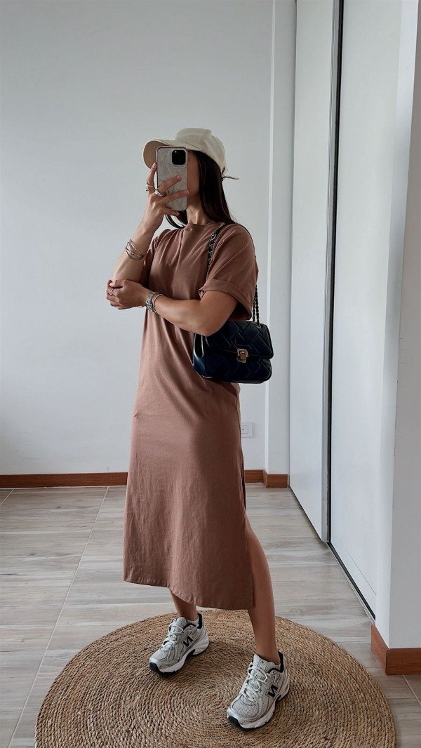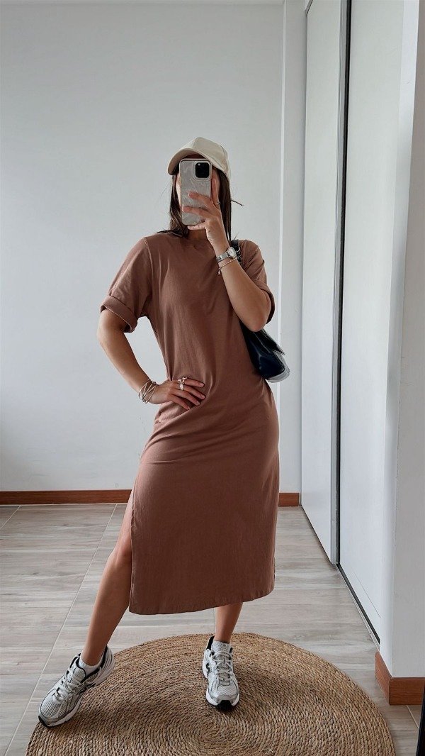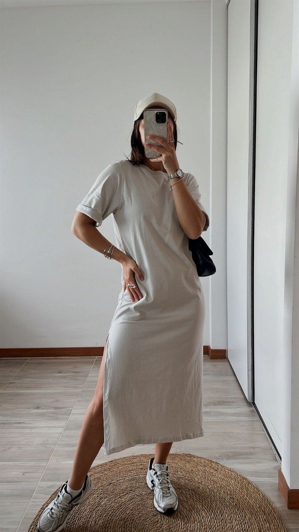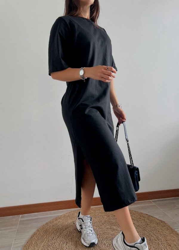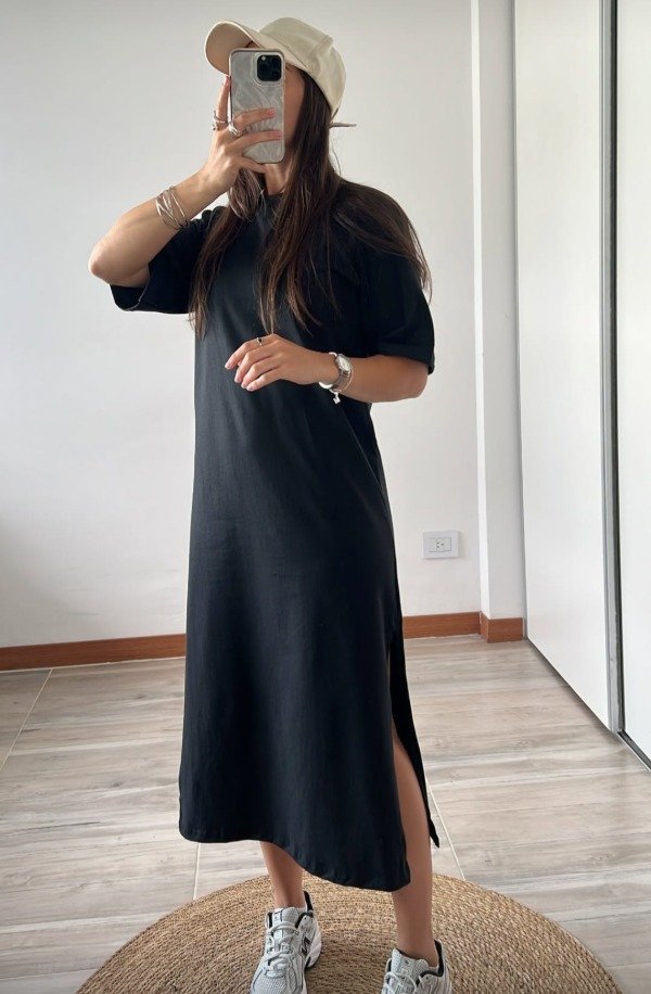 Vestido de algodón, largo, estilo oversize con tajos a los costados.