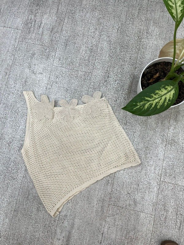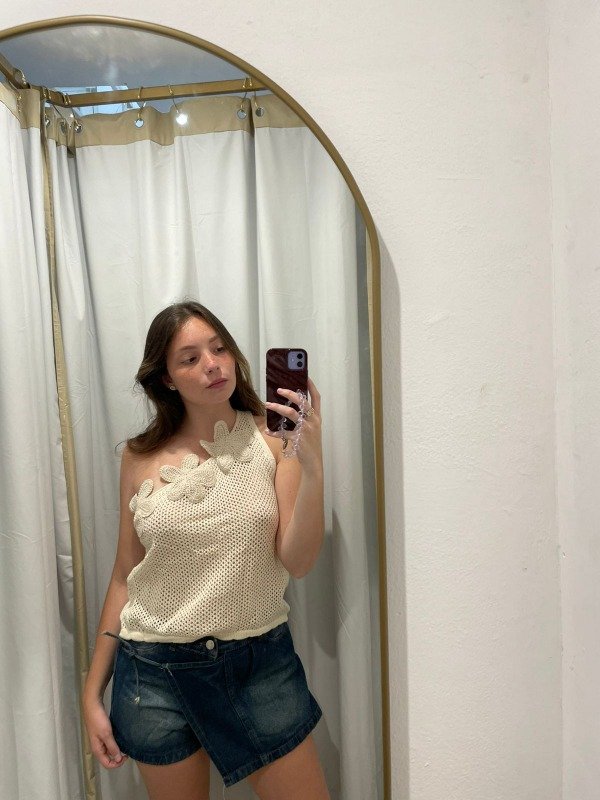 Top de hilo de algodon, un solo hombro con detalle de flores. Talle único, abarca hasta talle L.