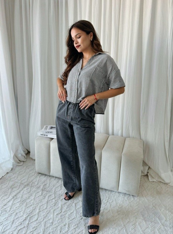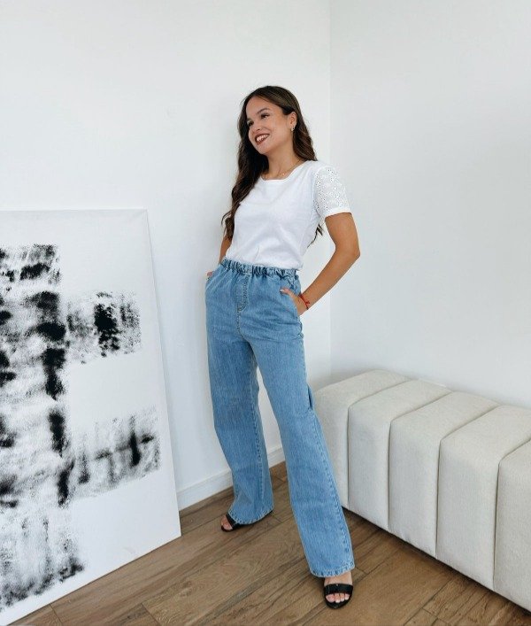Pantalón de jean palazo, con elástico en la cintura y bolsillos. Talles reales.