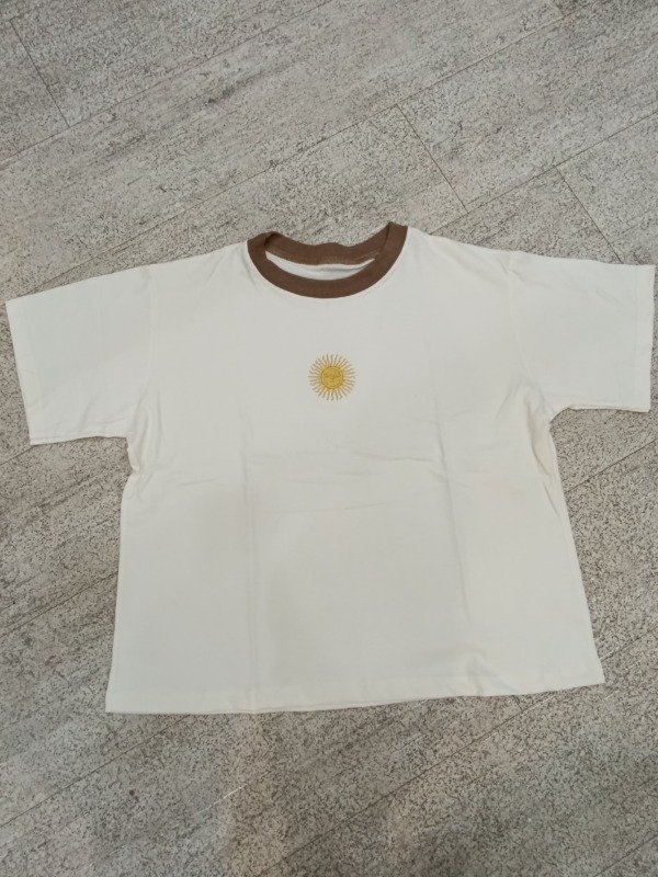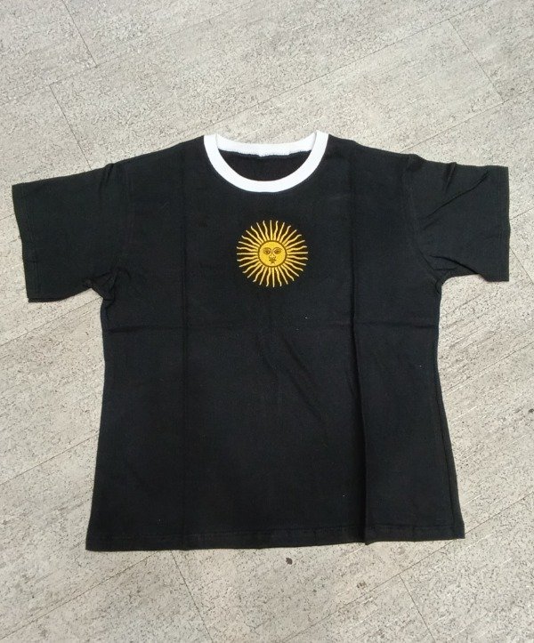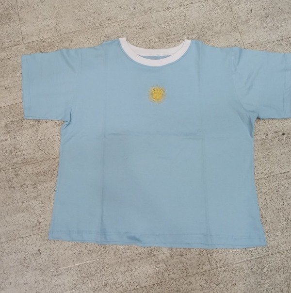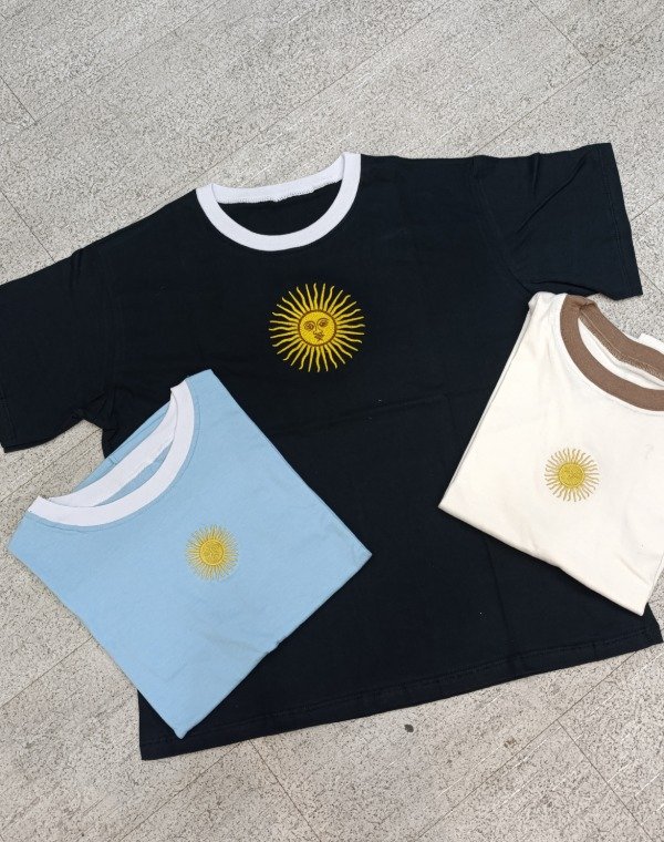 Remera de algodón combinada en cuello, con Sol de Mayo bordado. Calidad premium, talle único amplio.